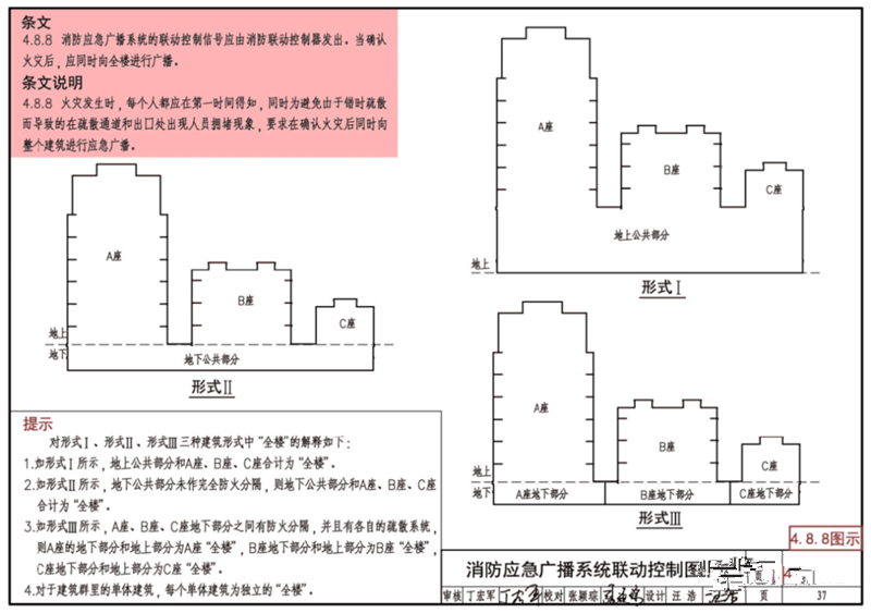 备注:“全楼”的范围定义参考国家建筑标准图集14X505-1《火灾自动报警系统设计规范图示》的解释,其中,住宅的常见形式Ⅰ、Ⅱ都是整体小区联动。